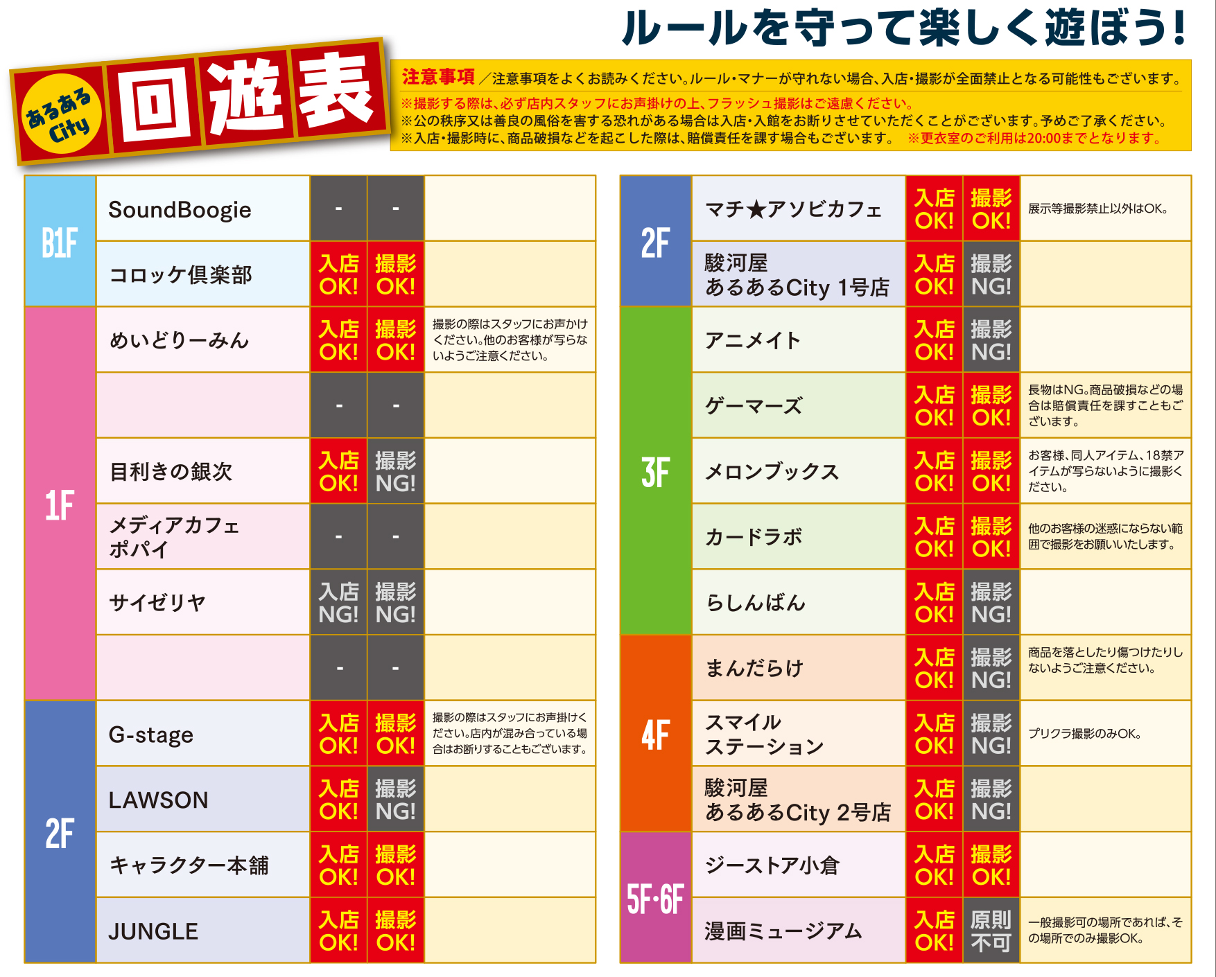 ・撮影マップ内の各ストア店舗内にて、【撮影可】の店舗は一眼での撮影は可能ですが、フラッシュの使用を禁止致します。また撮影の際は必ず店舗スタッフに一言お声がけ下さい。